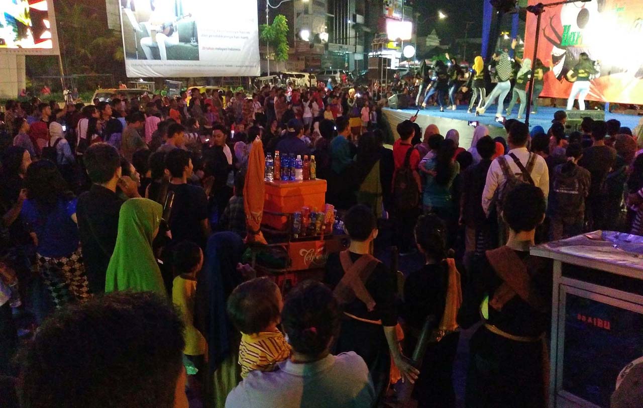 Sesampai di bundaran, parade para penari ini langsung membubarkan diri untuk beristirahat sambil menunggu waktu mereka untuk menaiki panggung. Dan pagelaran tari pun dimulai dengan penampilan dari penari anak-anak selagi hari masih terang. Dan saat saya tanya-tanya kepada panitia, Setelah istirahat magrib akan dilanjutkan dengan penari-penari remaja dan dewasa.