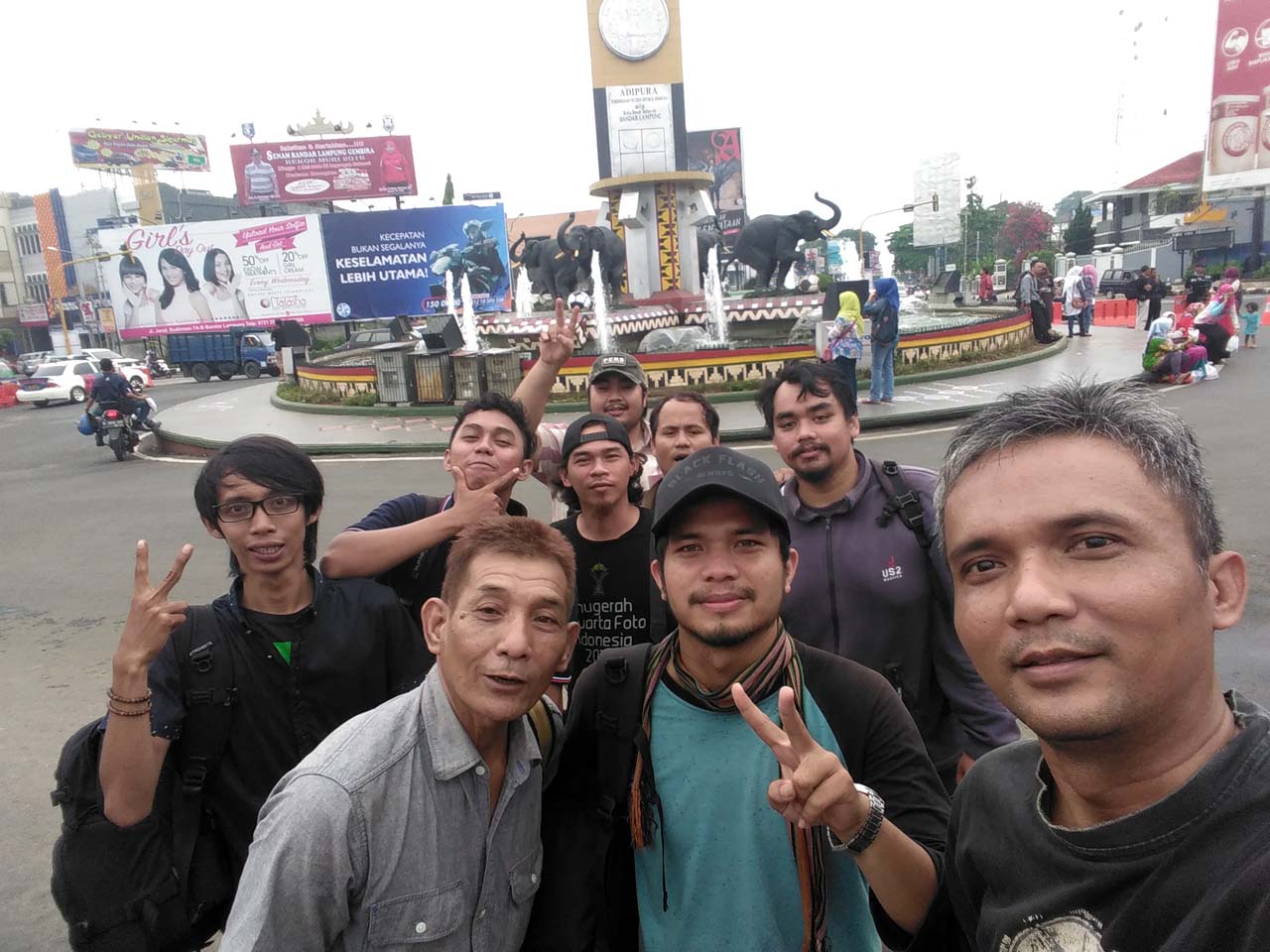 Sambil menunggu acara dimulai saya mendekati beberapa jurnalis foto media cetak dan online yang sudah menunggu. Ngobrol tentang isu-isu yang sedang berkembang di kota Bandar Lampung. Dan tak mau kalah dengan yang lain, kami juga foto selfie dengan latar belakang Tugu Adipura. Siapa takut…. 😀