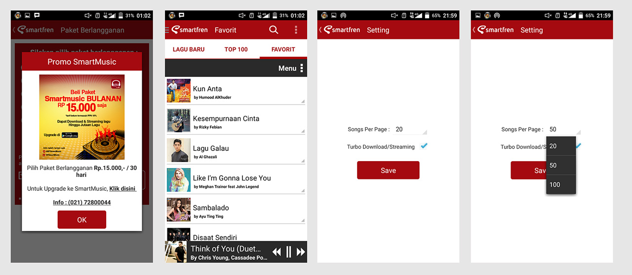 Salah satu aplikasi yang saya coba di Andromax R2 ini adalah Smart Music. Aplikasi yang saat dibuka sangat ringan ini langsung membuat saya jatuh hati. Terutama soal pilihan-pilihan lagunya yang OK. Ada pilihan berapa jumlah lagu tampil per page (20, 50, 100), dan turbo download/streaming. Untuk lagu, kita bisa pilih Lagu Baru, Top 100, dan Favorit. Asli deh, streaming lagu-lagunya ga pake gangguan loading.