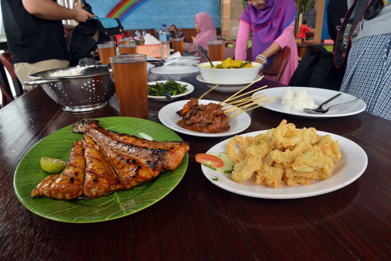 Di Rumah Makan Fega kami dihidangkan ikan bakar, cah kangkung, sate ayam, cumi goreng terigu, dan tentu saja Gangan.