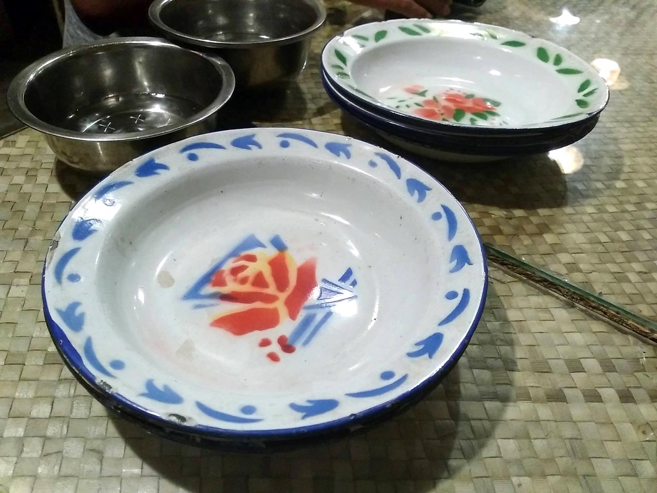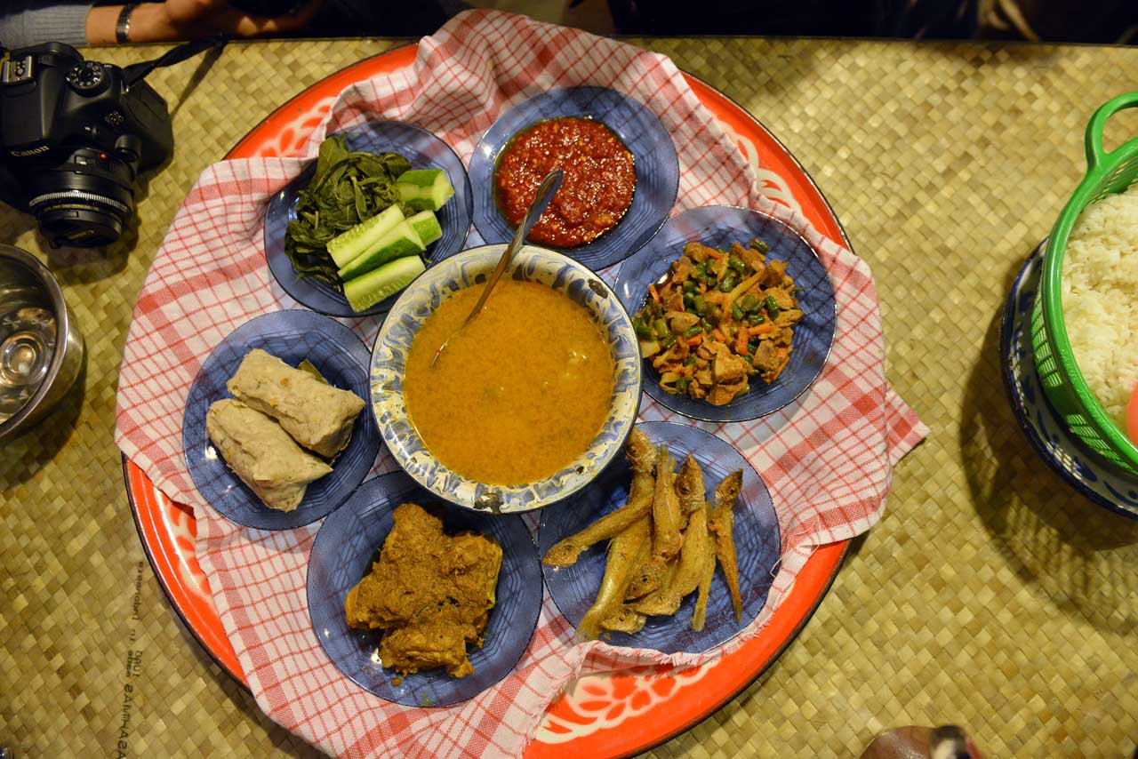 Dalam satu tudung ada beberapa menu yang disajikan. Malam itu kami makan dengan nikmat gangan daging sapi, sate ikan, ayam ketumbar, ikan bebulus goreng, oseng-oseng, sambal nanas, dan sambal serai. Sate ikannya enak banget, juga sambal serainya.
