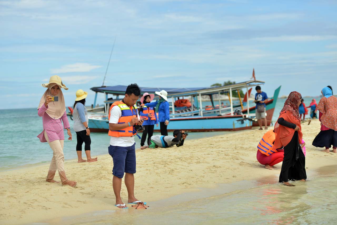 Lumayan lama bermain-main di pasir timbul ini. Sibuk foto-foto, sibuk difoto, lihat-lihat bintang laut, main air. 30 menit berlalu, kami melanjutkan perjalanan menuju pulau Lengkuas.
