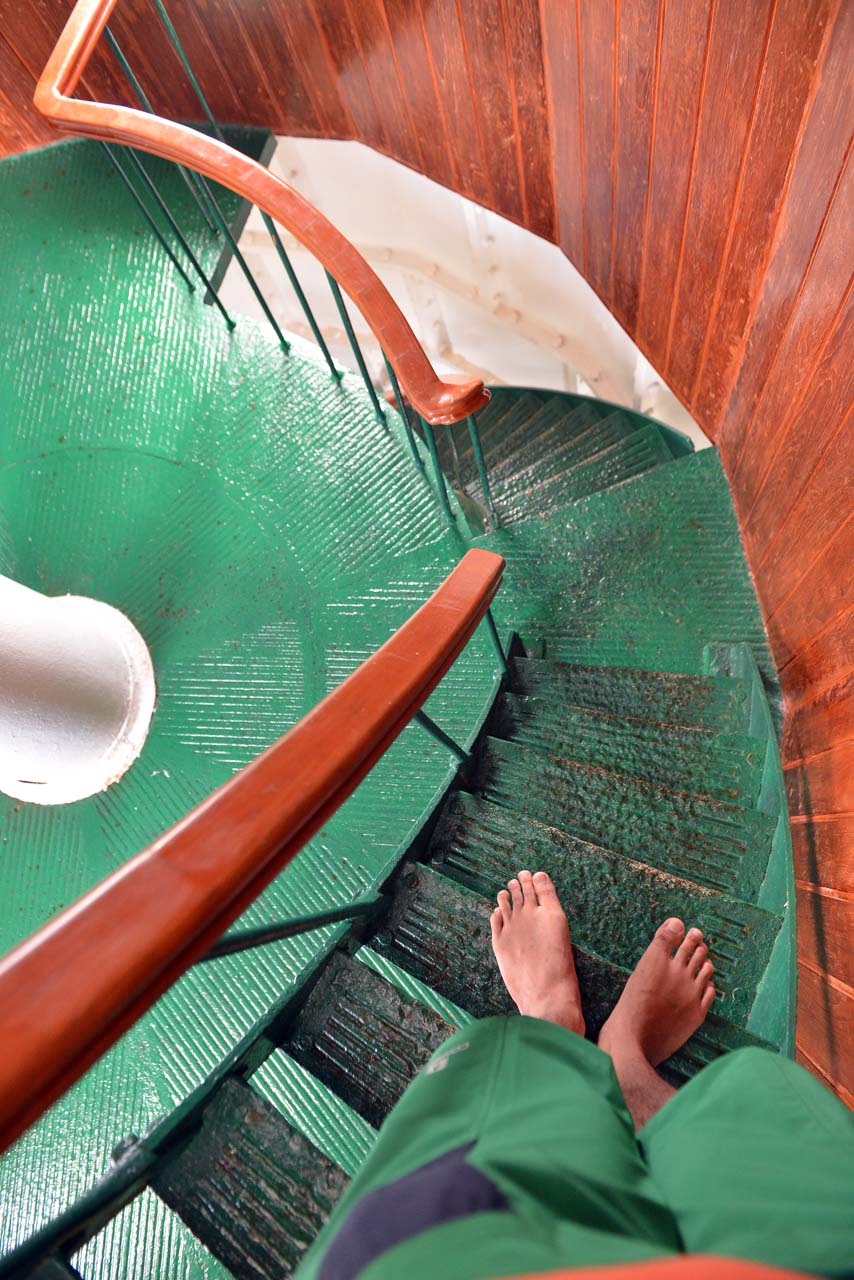 Menaiki tangga dan berada di ketinggian bukan lah sesuatu yang mengasikkan menurut saya. Boro-boro puncak mercusuar, naik tangga ke atas genteng rumah sendiri aja perlu mental baja. Nah kali ini saya harus menaiki banyak anak tangga untuk mencapai puncak mercusuar pulau Lengkuas di lantai 18. Badan boleh keliatan tegar, hati mah ciut, hehe..