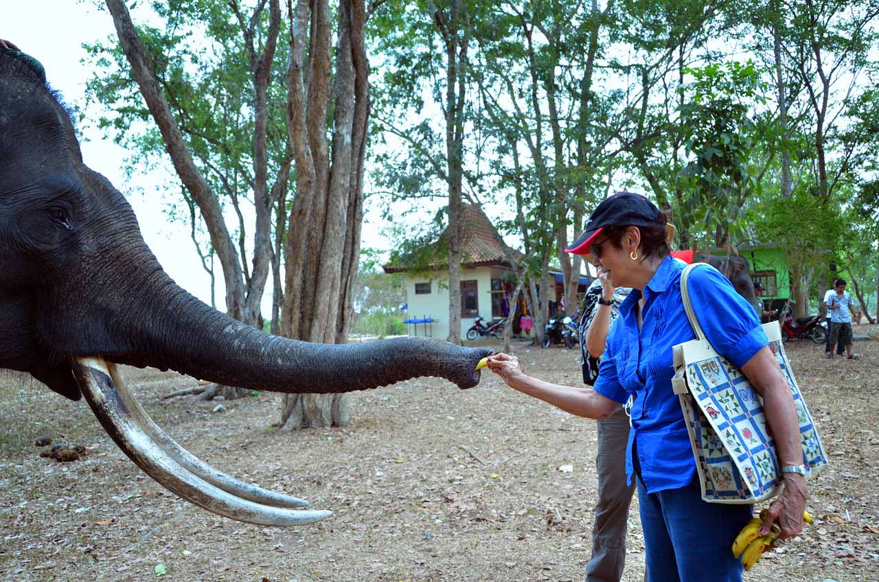 Agak ngeri juga untuk berdiri dekat-dekat dengan gajah meskipun kaki mereka diikat rantai. Yang kami dekati pertama kali adalah seekor anak gajah dan emaknya gajah yang berciri tidak memiliki gading. Yang saya takutkan kalau mendekati anak gajah, induknya itu bakal merasa terancam lalu menyerang kami. Di saat ragu-ragu itulah kebetulan lewat seorang pawang yang mengendarai motor yang lalu kami stop dengan ramah, siapa tau bisa menolong kami untuk mendekat.