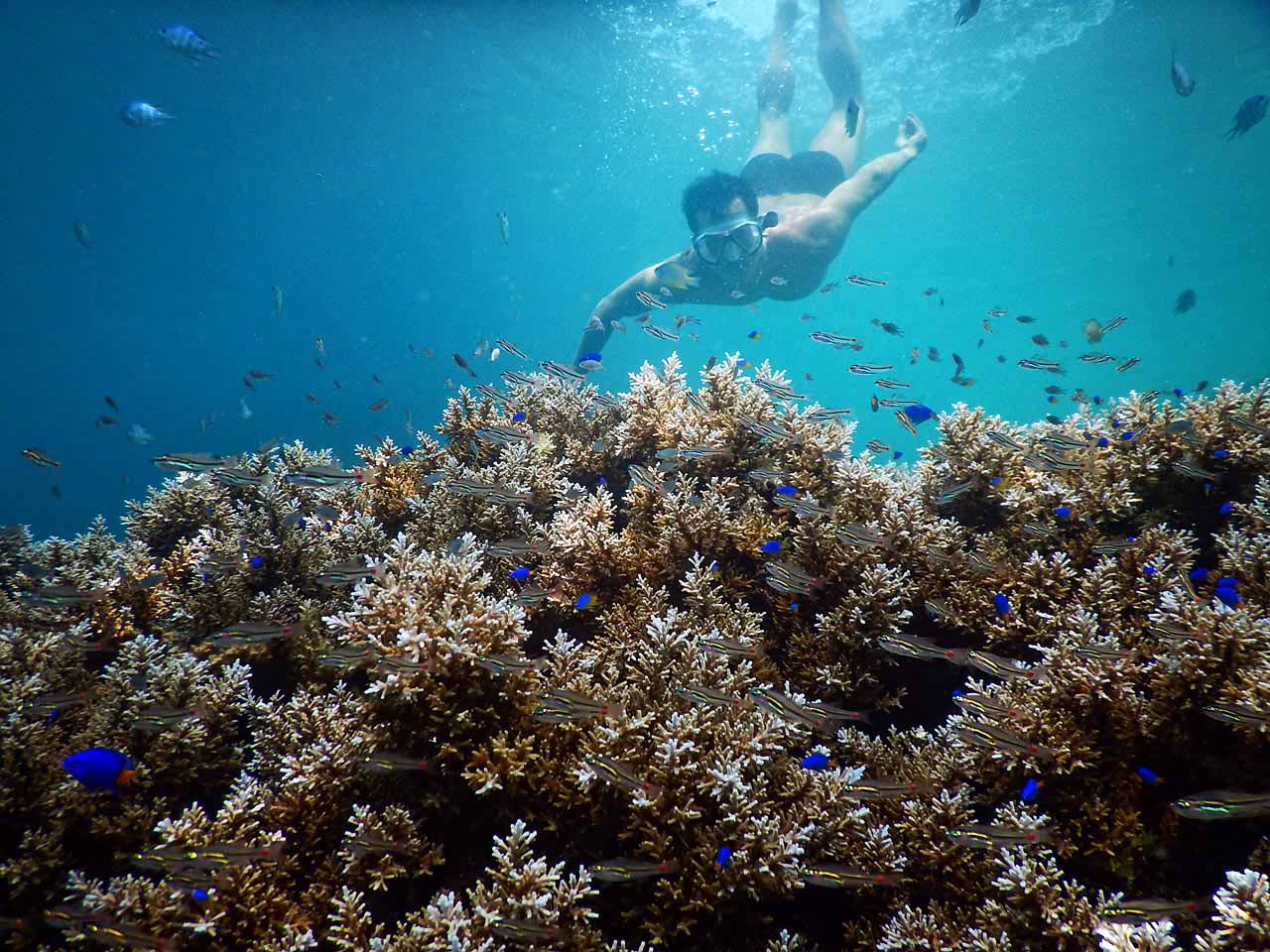 Di beberapa titik karang-karangnya masih sangat terjaga dan ikan-ikannya banyak. Tak heran banyak juga orang yang memancing di sini.