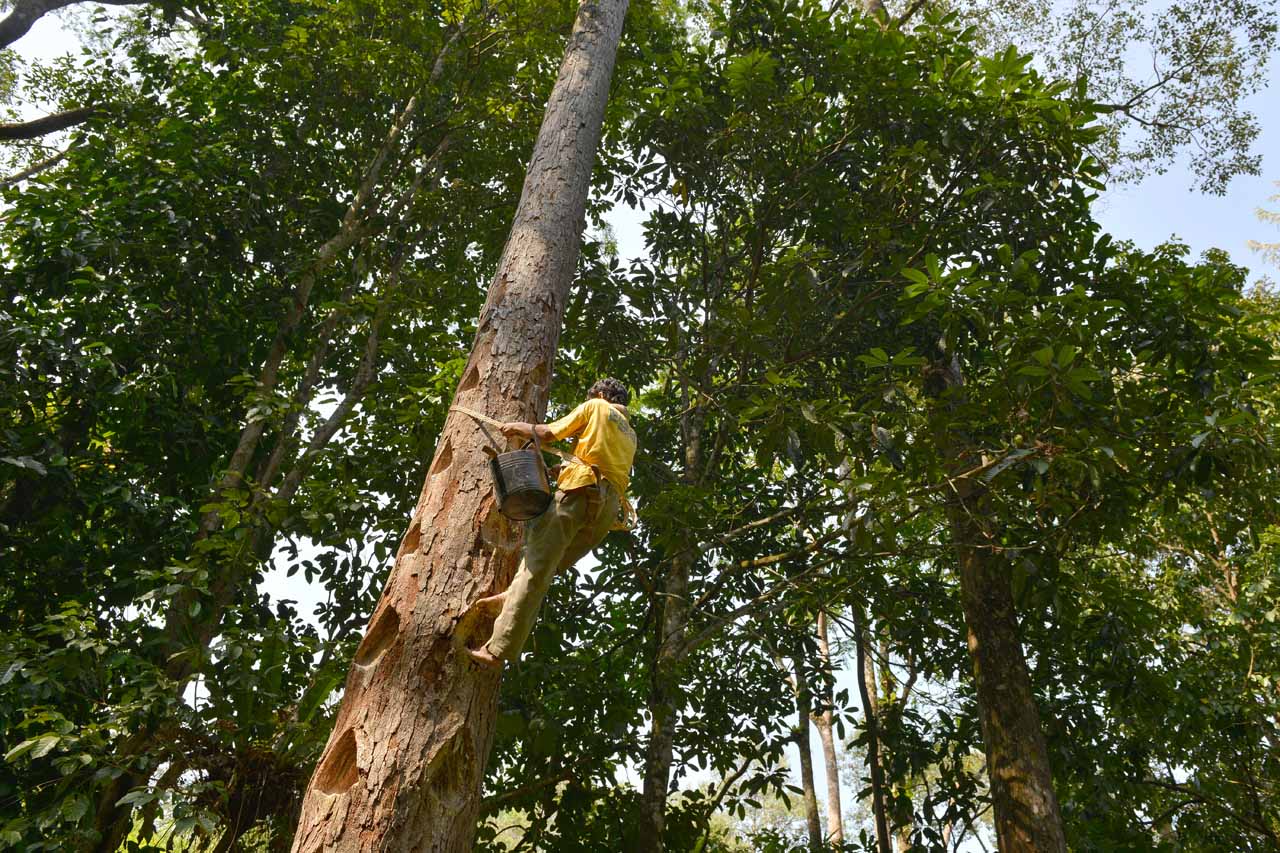 Tidak menyangka sudah ada guide di sini, kami bisa langsung ke lokasi-lokasi yang sedang ada kegiatan panen damar. Benar saja, tidak lama setelah memasuki repong damar kami sudah bertemu dengan seorang yang sedang bersiap-siap memanjat pohon dengan bantuan seutas anyaman rotan berbentuk lingkaran. Rotan itu digunakan untuk menahan badannya saat memanjat dengan sandaran batang pohon. Sebuah atraksi memanjat pohon damar yang menarik untuk direkam.