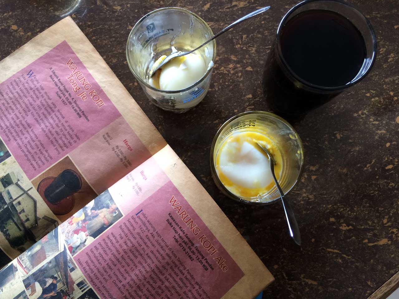 Kopi O, kopi susu, dan teh bunga yang sampai duluan di meja. Tak lama kemudian pesanan telur setengah matang 3/4 saya sampai. 30 (tiga puluh) menit ada di sini, seruput kopi dan telur setengah matang, bincang-bincang dengan koh Akiong keturunan ketiga warung kopi.