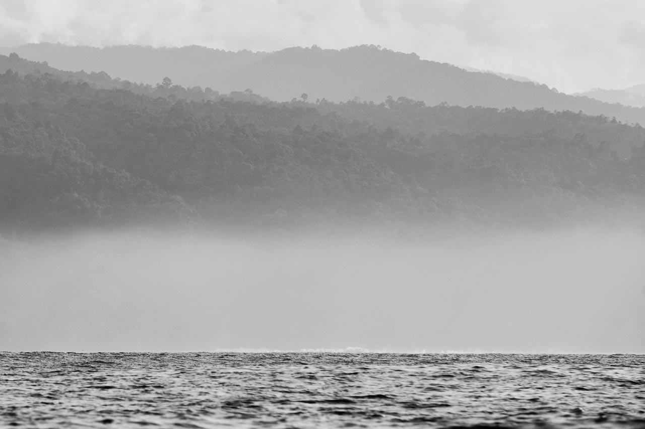 Pukul 10:00 saya berpamitan kepada bang Joni. Berjanji akan kembali lagi dengan mengajak banyak tamu sebanyak-banyaknya. Angin mulai turun berhembus, awan mendung sudah bergelantungan. Berharap melihat lumba-lumba lagi di perjalan pulang menuju pelabuhan Kuala Stabas. Namun hanya hujan dan percikan air laut yang membuat pakaian kami basah. Tapi muka-muka kami terlihat senang sekali, sudah bisa melihat lumba-lumba dan keindahan Pulau Pisang.