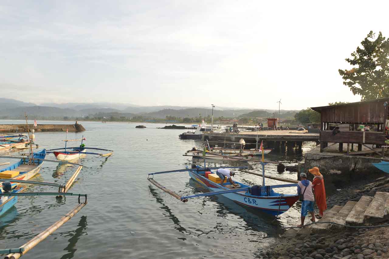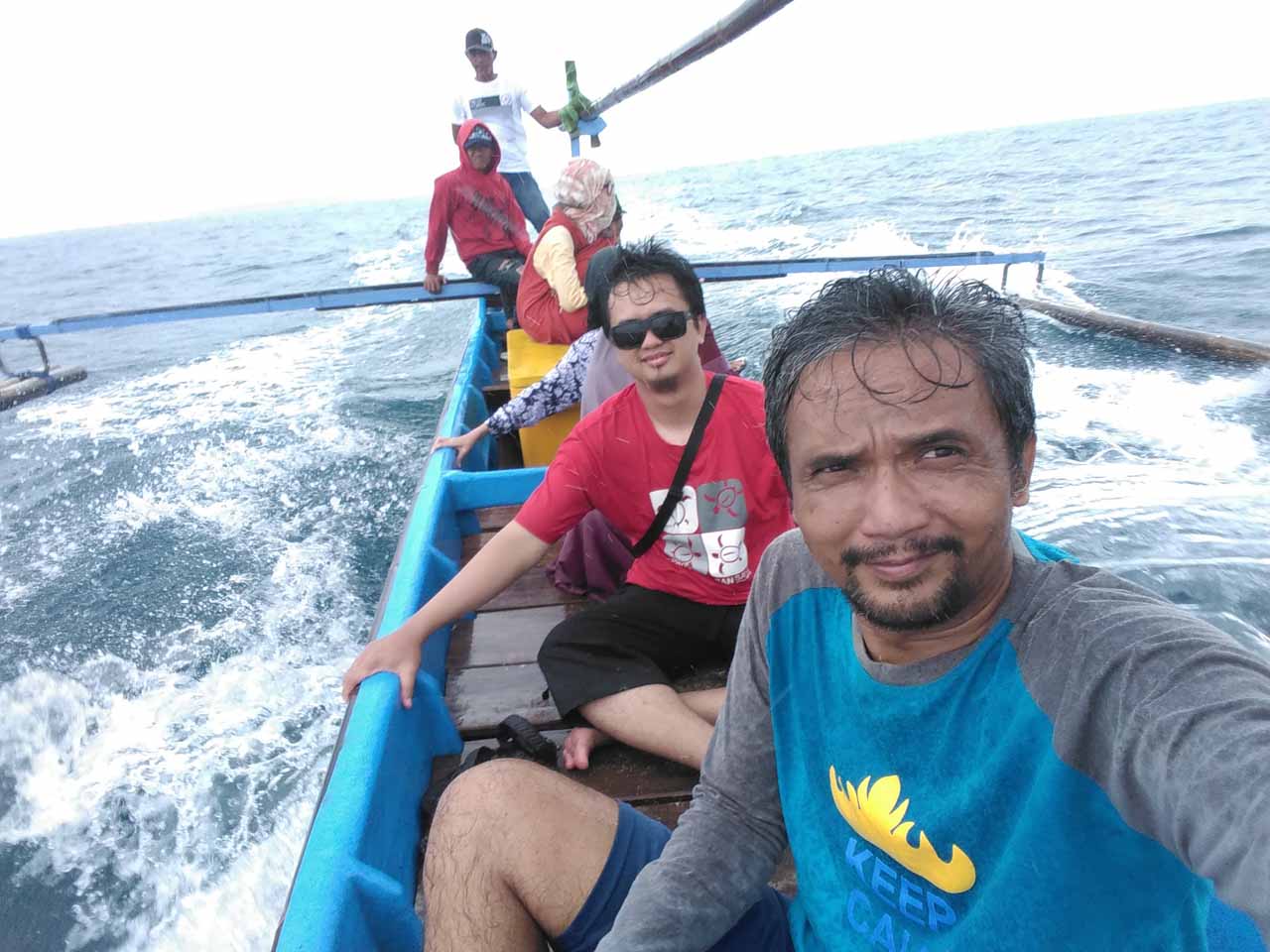 Pukul 07:00 perahu sudah keluar dari pelabuhan yang terlindungi dari gelombang Samudera Indonesia oleh susunan beton memanjang. Perahu yang bisa memuat sampai sekitar 10 (sepuluh) orang penumpang ini terasa cukup ringan hanya membawa 4 (empat) penumpang ditambah 2 (dua) kru kapal. Keluar dermaga kapal langsung tancap gas mengarah ke Pulau Pisang.