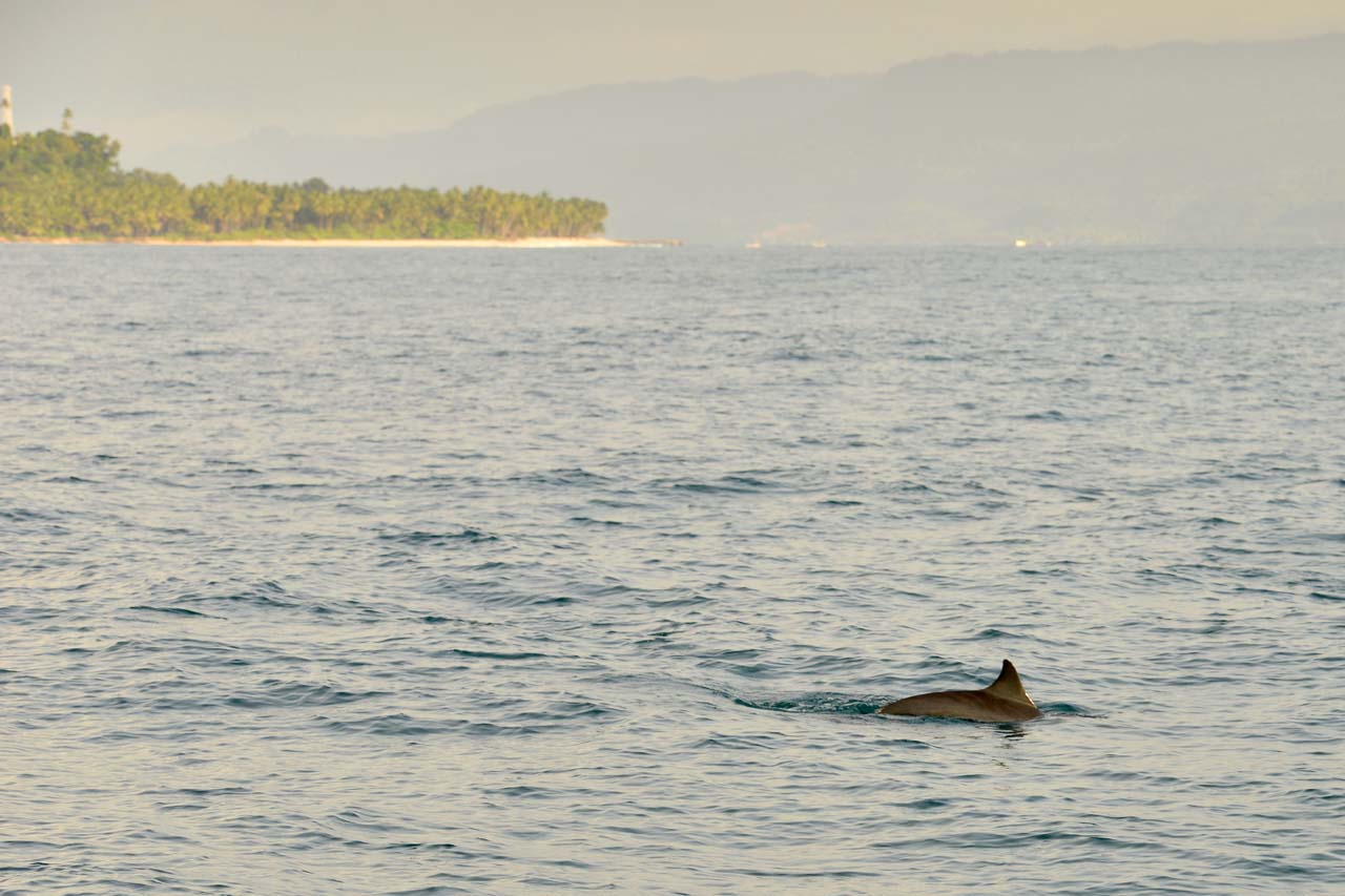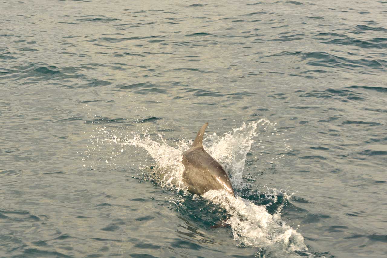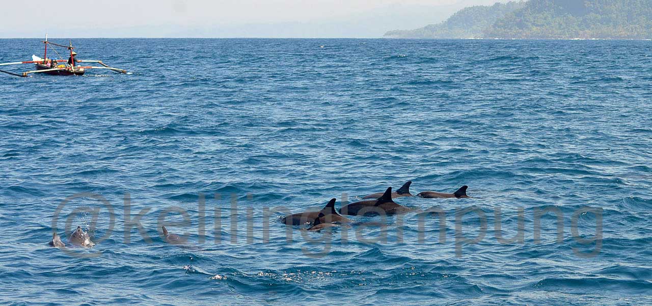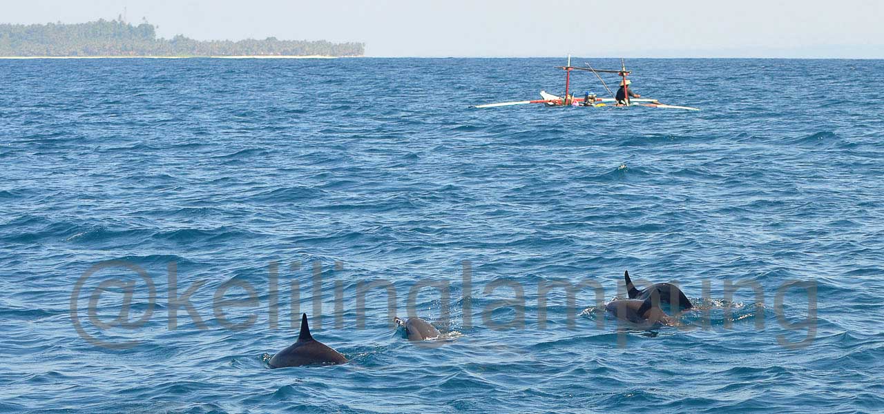 Tiba-tiba (pukul 07:20) pemilik perahu teriak kepada kami, ada lumba-lumba di arah sebelah kiri. Sontak saya palingkan muka mencari sirip-sirip khas lumba-lumba di permukaan. Belum terlihat. Ada kesempatan beberapa detik untuk mengeluarkan kamera yang sudah terpasang lensa tele 70-200 mm. Berharap dan berdoa banyak bisa mendapatkan foto-foto bagus pagi ini.